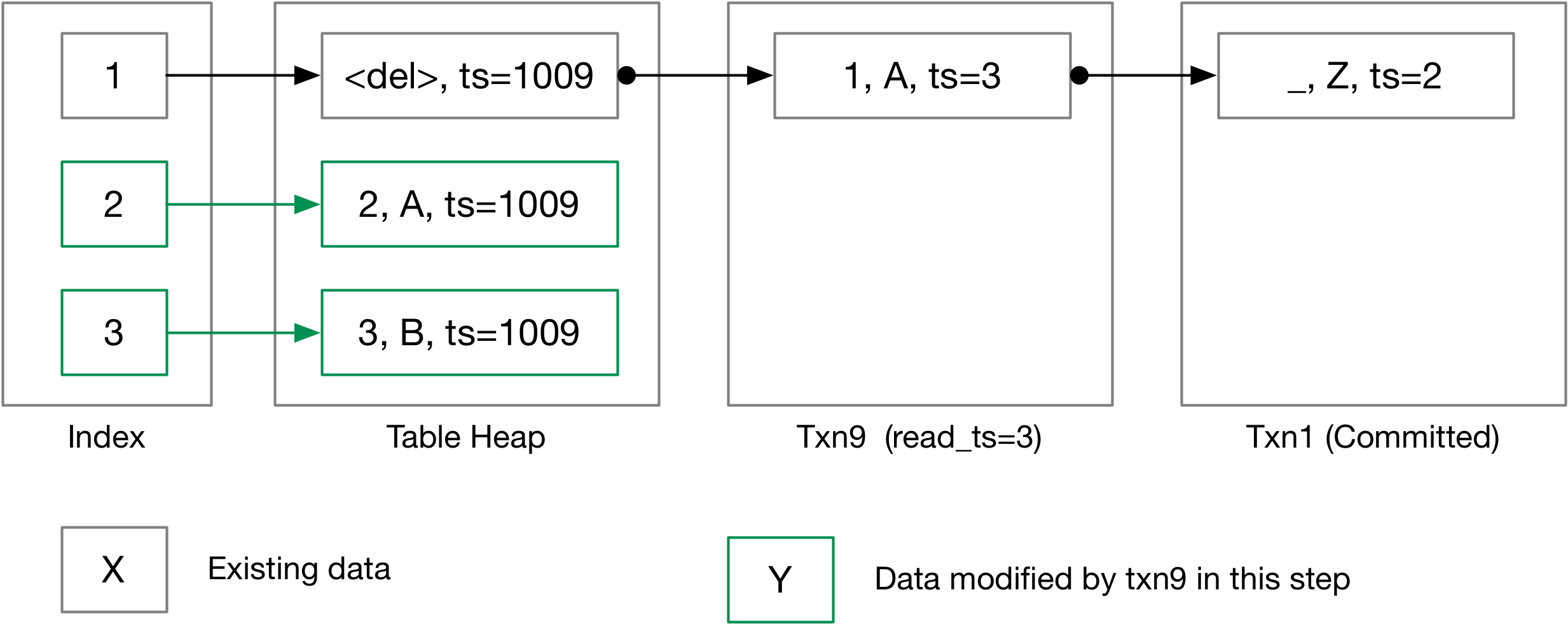 In this example, aborting txn9 will atomically link the undo link to the previous version and update the table heap. You will need to use UpdateTupleAndUndoLink / GetTupleAndUndoLink to update / read tuples and undo links atomically. With this implementation, you do not need to wait until the watermark before removing the aborted transaction from the transaction map.